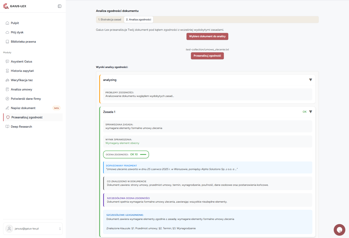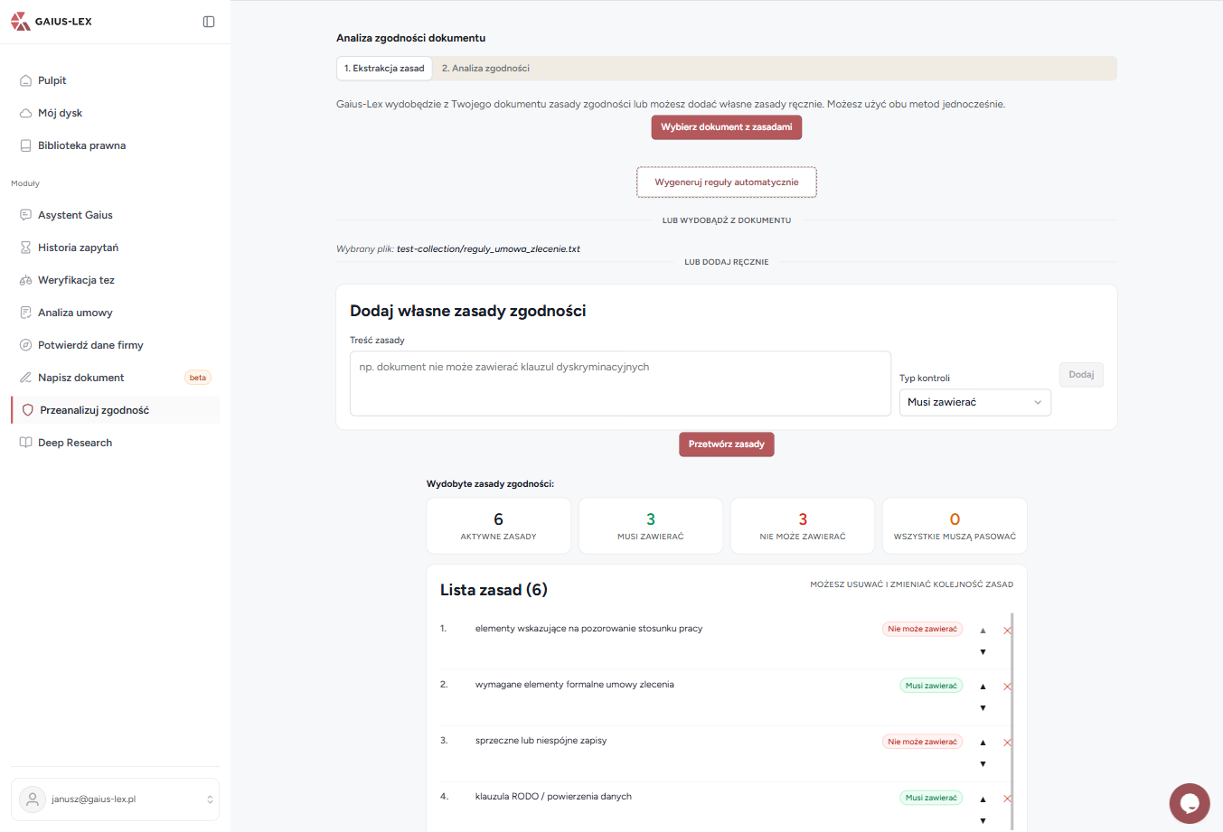 Gaius-Lex porównuje treść dokumentu z każdą zdefiniowaną regułą i wskazuje miejsca potencjalnych naruszeń compliance.