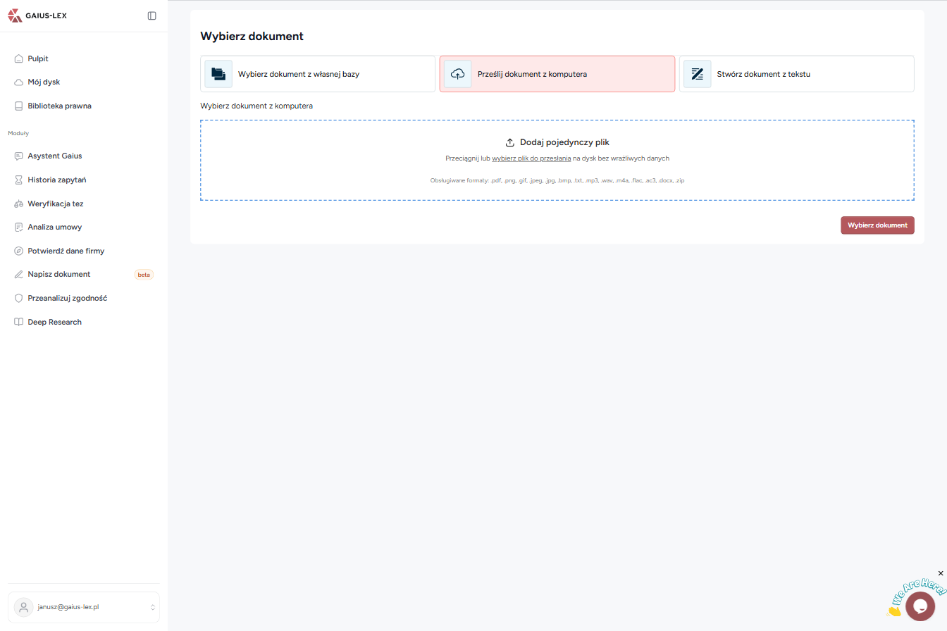 Prześlij pismo, wybierz dokument z własnej bazy albo wklej jego treść. Gaius przygotuje go do automatycznej analizy tez – zarówno Twoich, jak i strony przeciwnej.